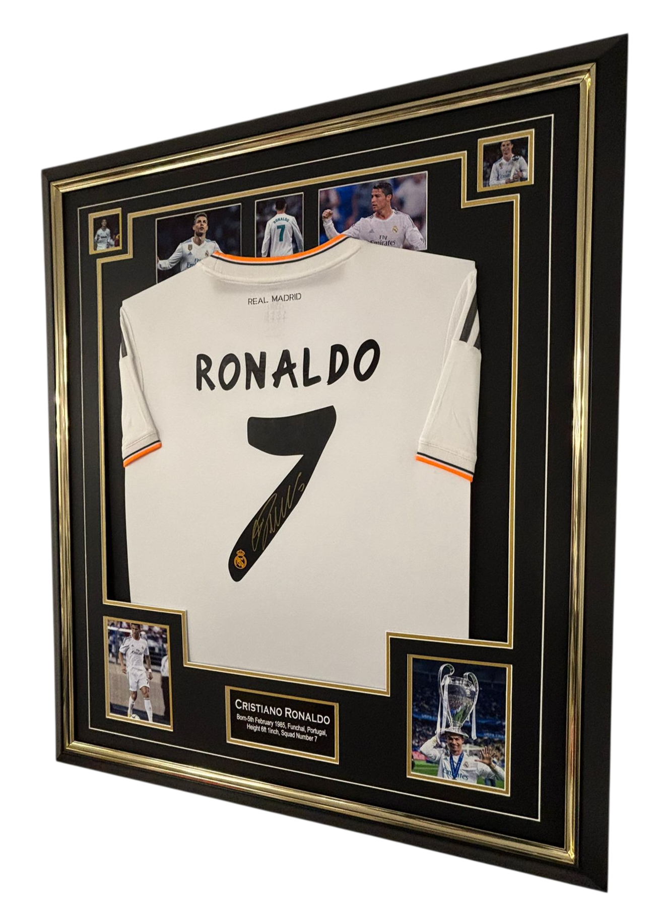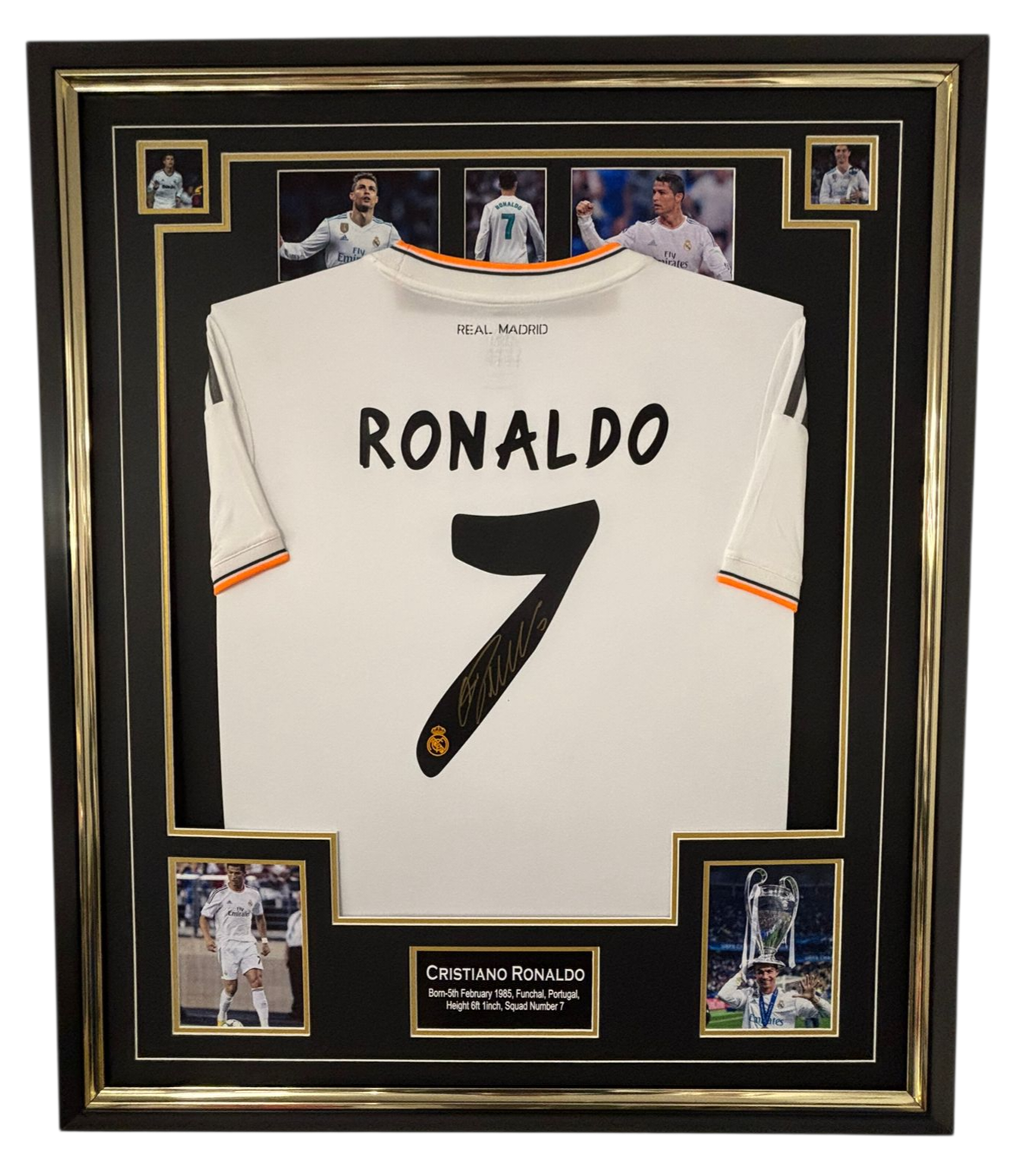 Framed and Autographed Cristiano Ronaldo of Madrid Signed Jersey.