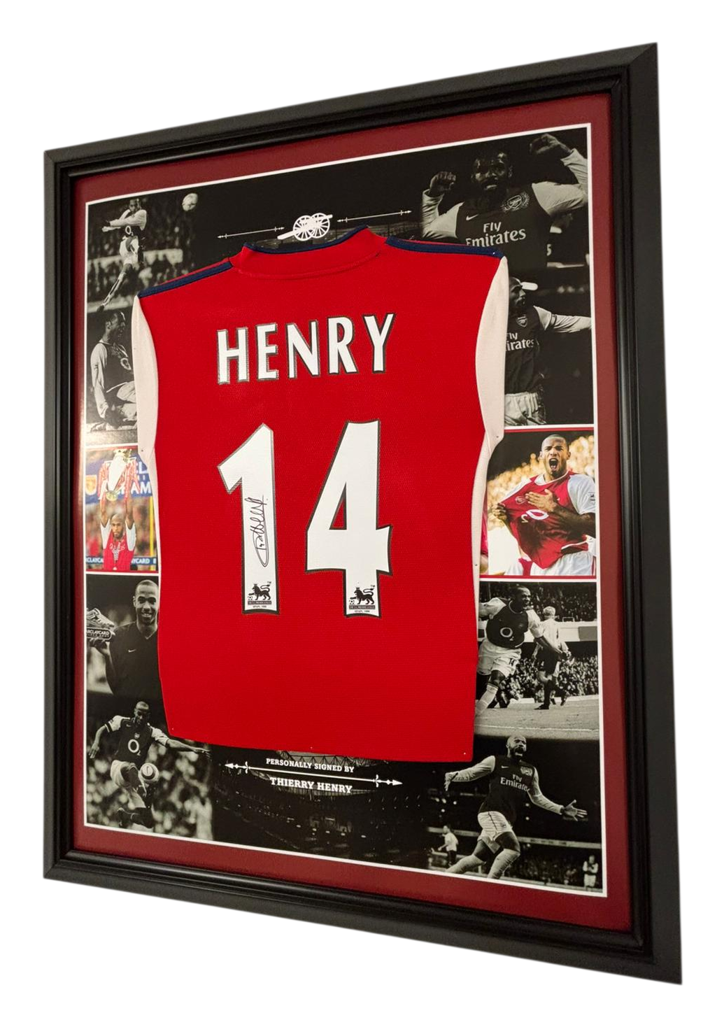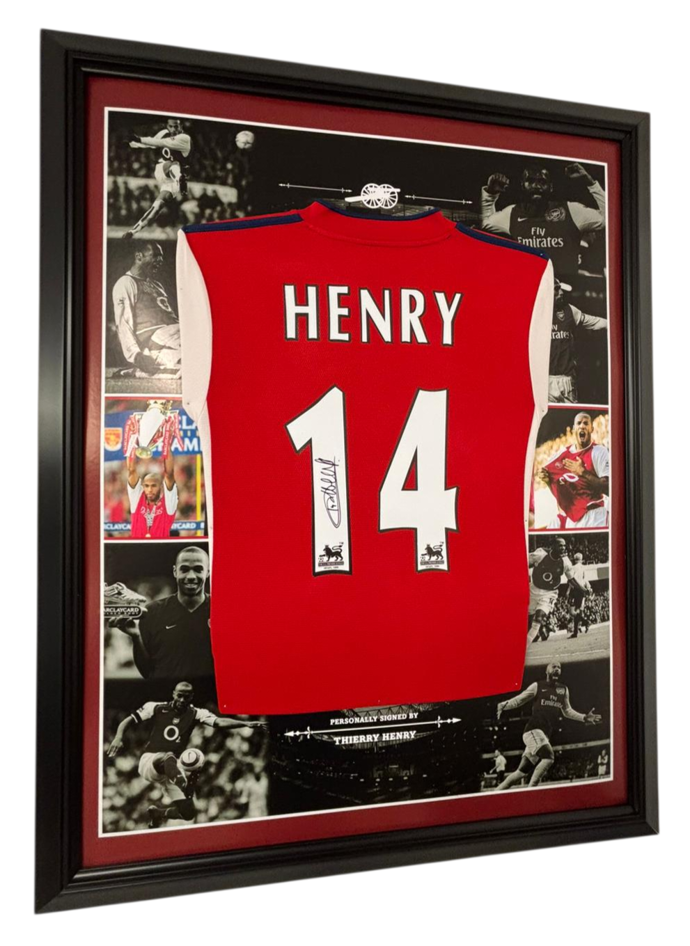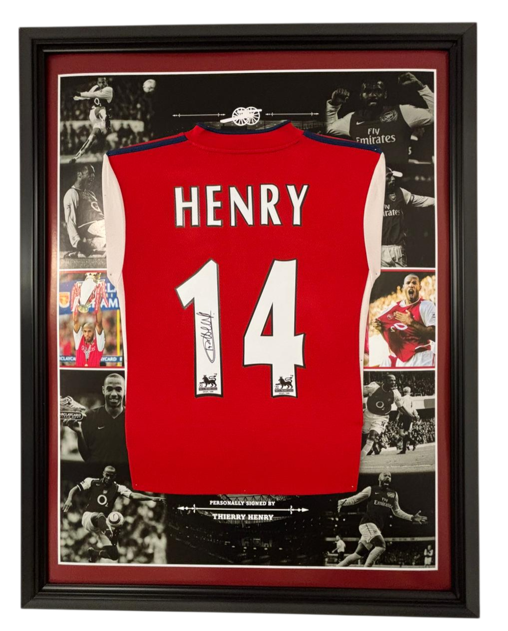 Framed and autographed THIERRY HENRY Signed FOOTBALL Jersey.