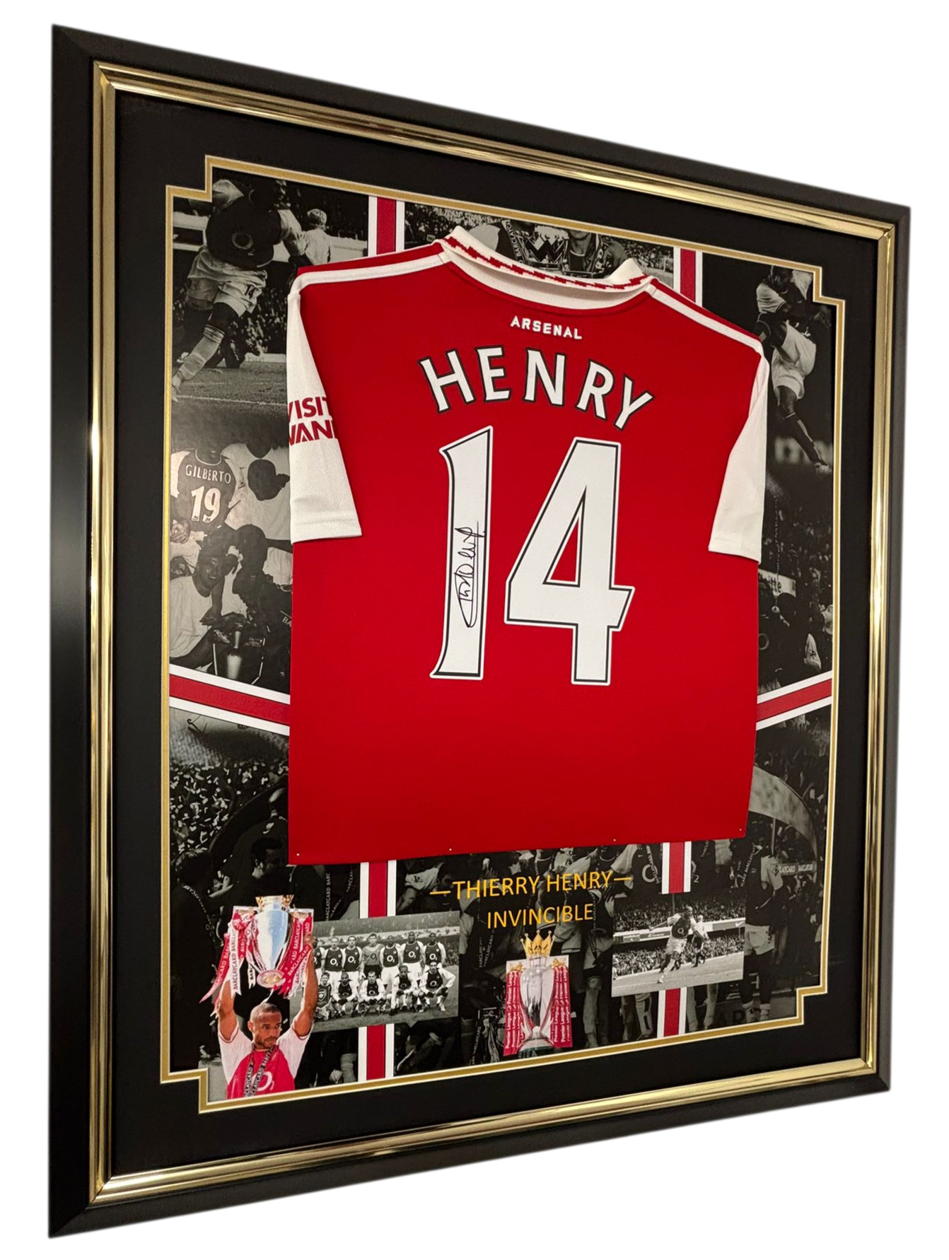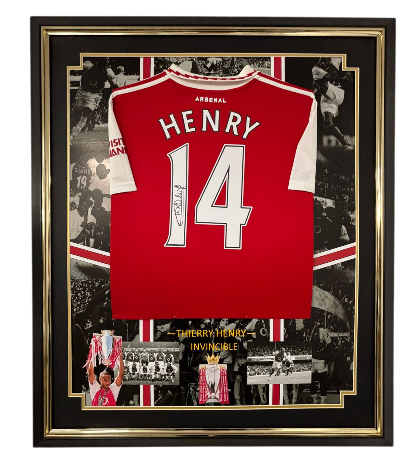 Framed and autographed THIERRY HENRY Signed FOOTBALL Jersey.
